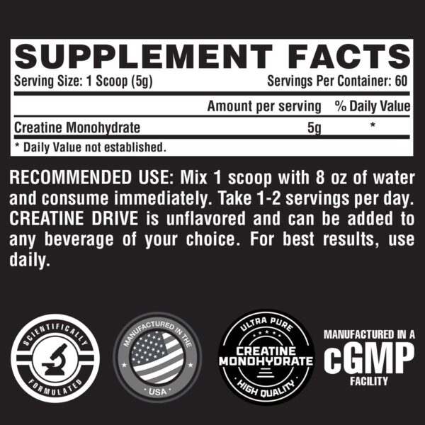 Mezcle 1 cucharada en 237 ml de agua. Consuma de 1 a 2 porciones al día. Para obtener mejores resultados, úselo a diario. La CREATINA no tiene sabor y puede añadirse a cualquier bebida de su preferencia.