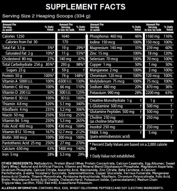Como Suplemento Alimenticio, mezclar 2 scoops, 334 gramos (medida dentro del recipiente), con 700 ml de agua o 950 ml de leche y tomar durante el día. Recomendación: Super Mass Gainer es altamente concentrado y quizás sea conveniente tomar 1 scoop después del entrenamiento, y el otro 1 scoop a lo largo del día, o como lo indique un profesional de la salud calificado. Varía la cantidad de líquido para lograr la consistencia deseada. Para aumentar la ingesta de proteína por porción y lograr un mejor sabor, utilizar leche descremada o baja en grasa.